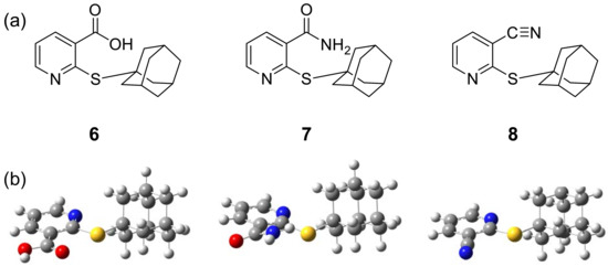 Chemical structures (a) and geometrically optimized structures at B3LYP/6-31g(d) (b) of thionicotinic acid analogs 6-8.