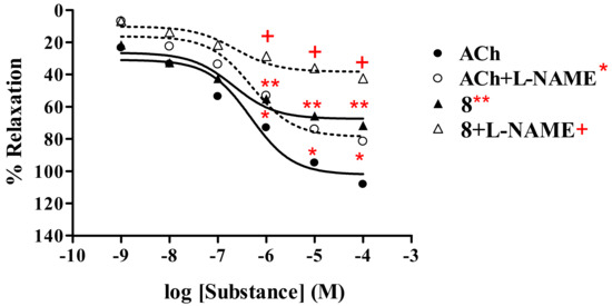 Similar results (Table 1, Figure 4) were observed for thionicotinamide derivative 7 and ACh, which exhibited Rmax of 77.7% and 109.9% with ED50 of 1.25 × 10-7 and 5.29 × 10-7 M, respectively. In the presence of L-NAME (1 mM), the dose-response curve of thionicotinamide 7 and ACh was shifted to the right. Rmax of derivative 7 and ACh was found to be 43.7% and 83.5%, whereas ED50 were 2.66 × 10-7 and 5.49 × 10-7 M, respectively.