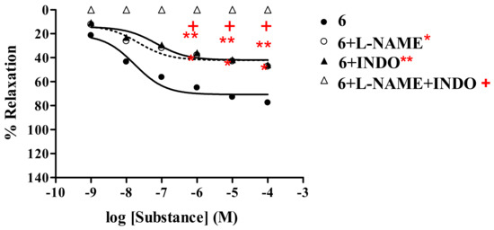 The vasorelaxant activity of analogs 6-8 was investigated in the presence of INDO (1 mM), compared with L-NAME (1 mM) and L-NAME plus INDO. The results (Table 3) revealed that experiments carried out with L-NAME or INDO showed significant reductions of vasorelaxation (Figure 7) in a dose–dependent manner.