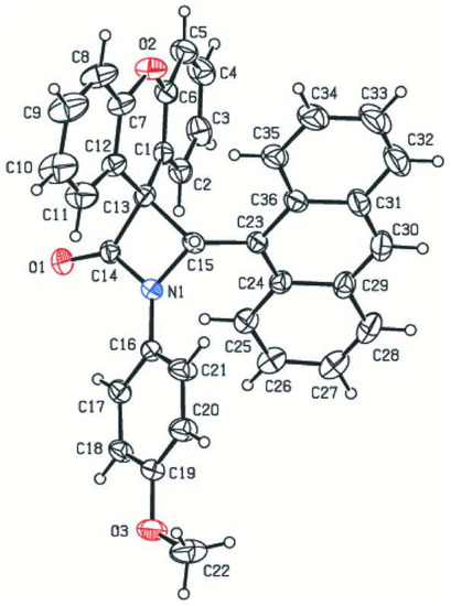 The X-ray crystallography of 2a (Figure 1) confirmed the proposed spiro configuration at C3 [54,55,56,57,58,59]. The X-ray analysis also showed that the β-lactam ring is planar and it is perpendicular to xanthene ring. The anthracene ring has dihedral angles of 51.8° with the β-lactam ring.