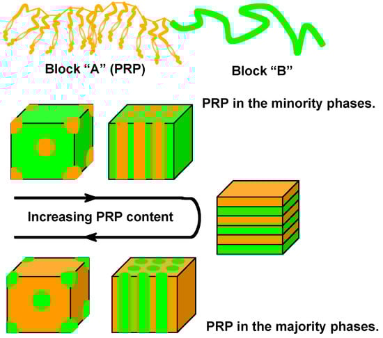 Because of the immiscibility of a PRP and other blocks of PRBCs, the PRP segment self-assembles into a rich variety of nanostructures, which is quite similar to the common BCs without chromophores [15,16,17,18]. Generally, AB-type diblock copolymers form separated phases (e.g., spheres, cylinders), lamellae or continuous phases by gradually increasing the PRP content in PRBCs, which makes their properties different from those of PRP blends or random copolymers. Figure 1 shows schematic representation of microphase separation of AB-type PRBCs, in which the block “A” and “B” represent a PRP segment and a non-PRP block, respectively.
