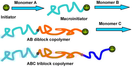 Some special reactions with a particularly designed route have been used to synthesize PRBCs, and such a reaction route includes at least two polymerization processes. As shown in Figure 5, an initiator with a specified structure is used to prepare a macroinitiator with only one initiator in one polymer chain. Under certain conditions like light irradiation or thermal treatment, macroradicals can be formed by the decomposition of the macroinitiator. This induced additional radical polymerization of a chromophore-containing monomer from the decomposed points in the segment. Thus, AB-type or ABA-type PRBCs can be obtained by termination of the macroradicals. For instance, a series of poly(vinyl ether)-based PRBCs were synthesized by using living cationic polymerization and free-radical polymerization techniques [57]. 4.4′-Azobis(4-cyano pentanol) (ACP) was used to quantitatively couple two well-defined polymers of living poly(vinyl ether), initiated by the methyl trifluoromethane sulfonate/tetrahydrothiophene system. Then, the ACP in the main chain was thermally decomposed to produce polymeric radicals, which was then used to initiate the polymerization of MMA or styrene to obtain PMMA-based or PS-based PRBCs (AB or ABA types). Although the obtained PRBCs showed narrow polydistributions, no ABC-type PRBCs were prepared by such a reaction route.
