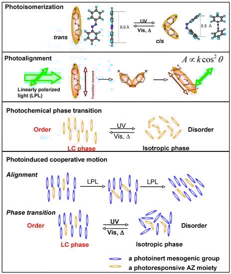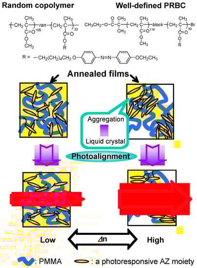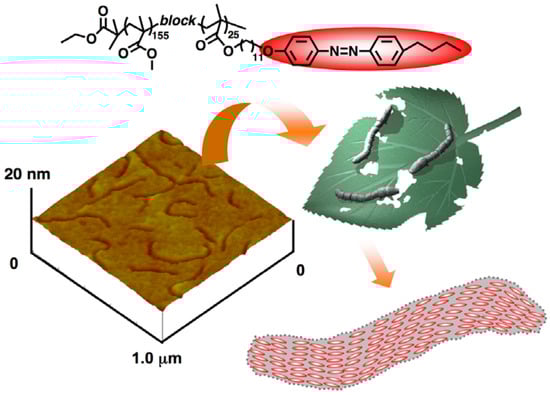 In the past two decades, photoresponsive polymers (PRPs) containing azobenzenes (AZ) and other chromophores in the side or main chains have been extensively studied as advanced materials with photoresponsive characteristics, many different aspects of which have been reviewed in [1,2,3,4,5,6,7,8,9,10,11]. Most of their excellent properties are based on photoresponsive behaviors, including photoisomerization, photocrosslinking (or photodimerization), photoalignment, and photoinduced cooperative motions. Incorporating a PRP as one of constituent segments into block copolymers (BCs), the obtained photoresponsive BCs (PRBCs) is expected to bring the photoresponsive feature of PRPs into the microphase separation of well-defined BCs. Especially, if the PRP block shows a mesogenic phase, the regular periodicity of liquid-crystalline (LC) ordering will influence on the microphase-separated nanostructures, making it possible to self-assemble into periodic nanostructures on a macroscopic scale [12,13,14].