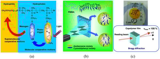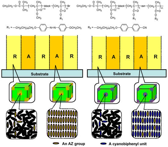 Because of the well-defined structure, PRBCs show excellent and different features from random copolymers. Recently, the molecular cooperative motion (MCM) between photoresponsive AZ moieties and other photoinert groups was studied in triblock copolymers with specifically designed structures [20,39,44]. Triggered by linearly polarized laser, AZs were first photoaligned due to the Weigert effect [19], and then non-photoactive groups were oriented together with the aligned AZ moieties under the function of MCM, although they did not absorb the actinic light [62,63].