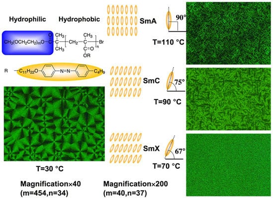 Recently, a modified ATRP method was developed to prepare novel amphiphilic PRBCs consisting of a flexible poly(ethylene oxide) (PEO) as hydrophilic segment and a poly(methacrylate) containing an AZ moiety in side chain as hydrophobic LC segment [14]. The unique characteristic of the obtained PRBCs was the nanoscaled microphase separation, in which a regular array of PEO nanocylinder (10–20 nm) with a periodicity of about 20 nm was dispersed in a smectic matrix. Starting from commercial available PEO, Yu et al. applied this approach to prepare several ABC-type PRBCs with photocontrol performances, as shown in Figure 3 [20,21].