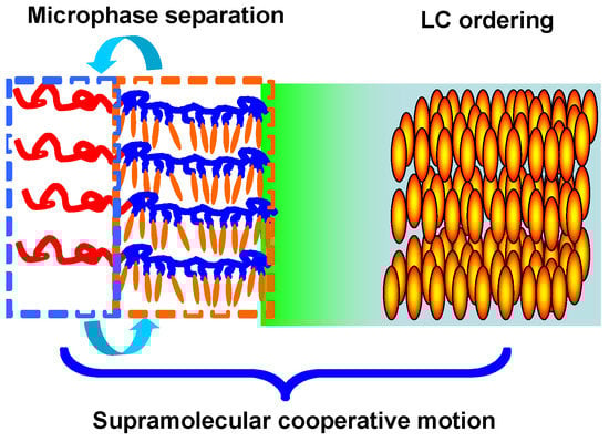 From the viewpoint of molecular design, LC PRBCs integrate the unique characteristics of both materials into one single system, which also possesses photoresponsive properties. Such a SMCM was regarded as one of the most effective approaches to control nanostructures in LC PRBCs [12,13], as shown in Figure 12. In the following part, several newly developed approaches to control nanostructures in PRBCs are discussed.