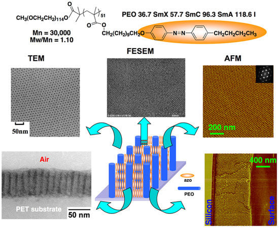 Specially designed amphiphilic LC PRBCs are good candidates to produce low cost materials with self-assembled nanostructures, leading to industrial applications in future engineering plastics. As shown in Figure 13, all the TEM, AFM and FESEM pictures reveal beautiful PEO nanocylinder structures with hexagonal packing, in an alignment direction perpendicular to the substrates [14,76,77].