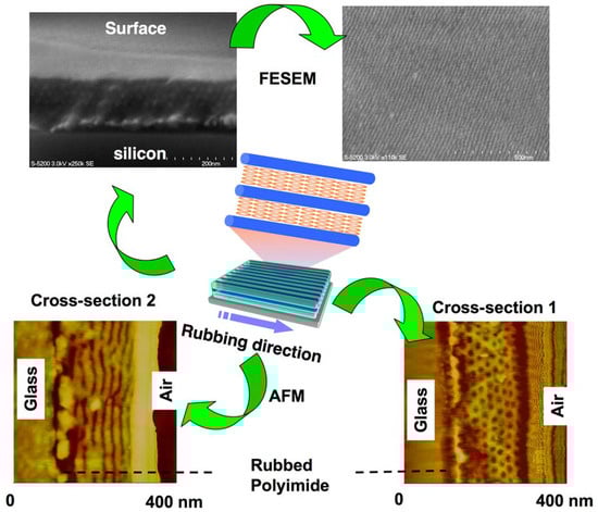 Parallel processes for patterning densely-packed nanostructures are often required in diverse areas of nanotechnology [78]. The regular nanostructures by self-assembly in amphiphilic PRBCs provided unique opportunity to prepare such a parallel stripe pattern by SMCM. To achieve this, a rubbing technique was chosen to homogeneously align LCs in PRBCs. The periodic ordering of oriented mesogens might be transferred to nanocylinders formed with non-PRP blocks by SMCM. It is well-known that LC molecules can be aligned along the rubbing direction on rubbed polyimide surfaces because of the lower energy level along the rubbing-induced grooves [79,80,81]. Such a method exhibited strong influence on the LC PRBC, as shown in Figure 14. After rubbing treatments, a parallel array of PEO nanocylinders coinciding with the LC alignment was clearly observed by AFM and FESEM images. This defect-free nanocylinder array was acquired over arbitrarily large areas on the surface of rubbed polyimide films. Similar to other methods of controlling microphase segregation in amorphous BCs, such as electric field, crystallization, controlled interfacial interaction, chemically or topologically patterned substrates, the rubbing technique exerted a forceful function on 3D arrays of nanostructures, which was suggested by the cross-sectional images of AFM and FESEM (Figure 14). The rubbing treated samples showed a regular surface relief of about 3 nm with a periodicity of 24 nm, possibly due to the confined crystallization of the PEO blocks embedded in the ordered LC phases [82]. Obviously, both the nanocylinder dimension and the surface periodicity could be easily adjusted by the volume fraction of PEO or PRP blocks in the PRBCs. The macroscopic 3D nanocylinder array with a long-range order was successfully achieved with arbitrarily controlled direction in plane, in which a novel pathway of controlling nanoscopic domains was opened over large areas [12,13]. The rubbing method has advantages of simplicity, convenience and low cost over other approaches, which can create opportunities for manufacturing nanoscopic devices. In the processes of nanocylinder alignment, the rubbing acts on the microphase domains by a bridge of LC media, implying that the nanostructures can be controlled by way of modulating LC alignment, which technologically implicate that other LC manipulating methods can be used to regulate microphase separation of PRBCs.