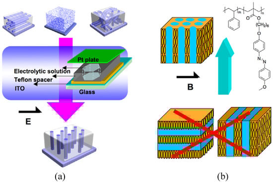 More recently, Kamata et al. developed an electrochemical method to control alignment of PEO nanocylinders perpendicular to the substrate in PEO-based PRBC films [85]. As show in Figure 16a, the PRBC films were prepared by spin coating on ITO glass kept at 50 °C for 2 days. Using the ITO glass as a working electrode, a sandwich-type cell was assembled with a Teflon spacer and an injected KBr aqueous solution as electrolyte. Under the function of an electrolytic potential in the potentiostatic mode with Pt counter electrode and Ag/AgCl reference electrode, all the nanocylinders were oriented parallel to the electrolytic field as the lowest energy alignment, in spite of the microphase-separated state, parallel or random alignment of PEO nanocylinders. It was believed that ion diffusion locally induced in the vicinity of the electrode could allow the hydrophilic nanocylinders normal to the substrate, making it possible to manipulate the microphase-segregated microdomains [85].