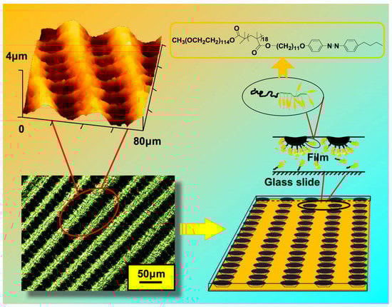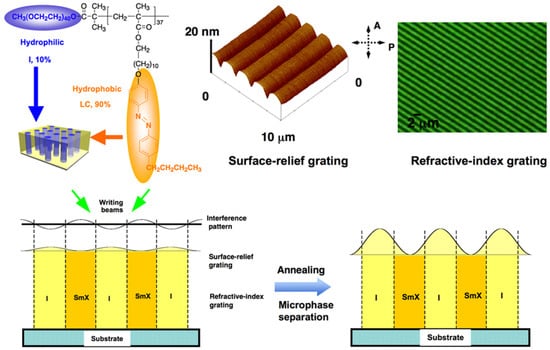 Holographic gratings have potential applications in information technology, which have been recorded on PRP films by utilizing their photoresponsive properties [93,94]. The diffraction efficiency (DE) is one of the most important parameters of holographic gratings. In amorphous PRP materials, a surface-relief grating contributes mainly to DE. It was reported that PRBCs were good candidates to control DE by enhancement of surface relief upon microphase separation [95,96,97]. In Figure 17, both a SRG and a refractive-index grating (RIG) were recorded upon irradiation of an interference pattern, in which selective photoisomerization and the isotropic-to-LC phase transition were induced in the bright areas. The DE of the gratings depended strongly on the polarization of the reading beam because of the photoalignment of mesogens.