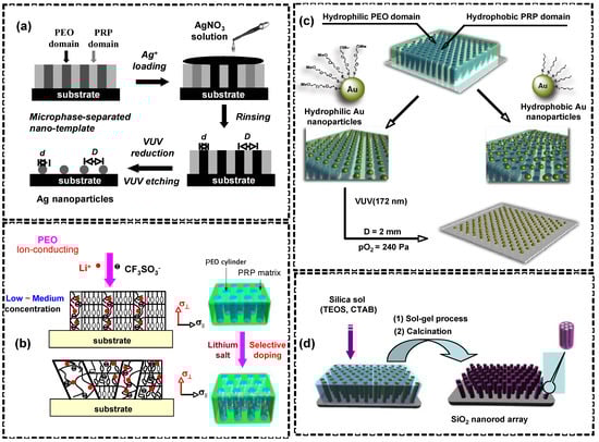 - Suzuki, S.; Kamata, K.; Yamauchi, H.; Iyoda, T. Selective doping of lead ions into normally aligned PEO cylindrical nanodomains in amphiphilic block copolymer thin films. Chem. Lett. 2007, 36, 978–979. [Google Scholar] [CrossRef]