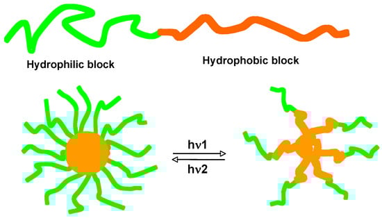 Confining a PRP block in a separated phase, which is smaller than the wavelength of visible light (400–700 nm), may eliminate the scattering effect and improve the optical performance of PRBCs. When the volume fraction of the PRP block is far larger than that of non-PRP blocks, the PRP segment enables to form the majority phase upon microphase separation. Such kinds of PRBCs behave similarly with that of the PRP. Furthermore, additional performances such as hydrophilicity [12,13,14], crystallization, optical transparency [20,21], thermoplastics [22], ionization [23], water solubility [24], and amphiphilicity [25,26,27] can be acquired by special molecular design of non-PRP blocks. Since the engrossing PRBC offers an effective and convenient chance to design advanced materials by integrating AZs and other chromophores with additional functionalities, it has become one of the emerging topics in photoresponsive macromolecular materials.
