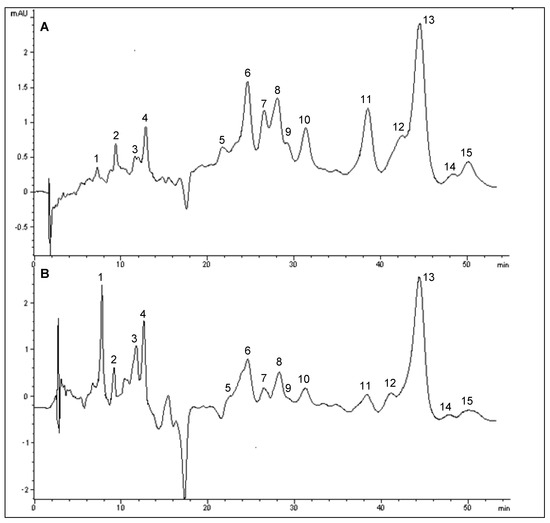 HPLC chromatogram of carotenoids in bambangan peel (A) and pulp (B) extracts.