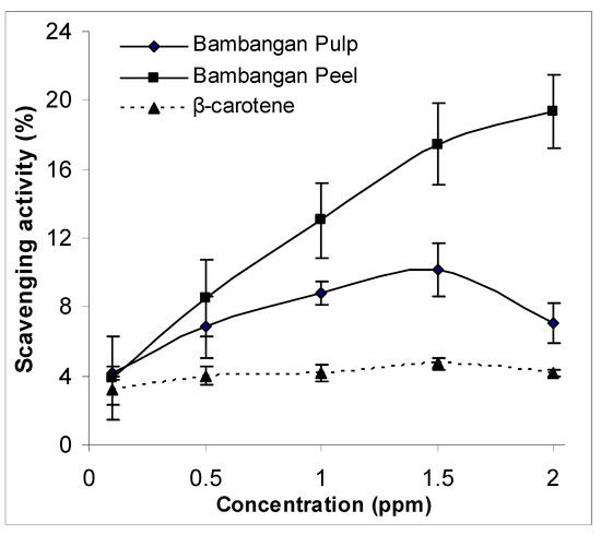 The scavenging activity (%) against DPPH radicals for bambangan peel and pulp extracts is shown in Figure 3. Results showed that the percentage scavenging activity of peel and pulp extracts at 0.1 ppm were not statistically different. However, a significant different was found between bambangan peel and pulp extracts at higher concentrations (0.5–2.0 ppm) (p < 0.05). The scavenging activity of the peel extract was concentration dependent. Compared to bambangan peel extract, the scavenging activity of pulp extract decreased when the concentration reaches an optimum level of 1.5 ppm. This finding is in agreement with Jimenez-Escrig et al. [11] that the scavenging effects of the superoxide anion free radical decreased with increasing extract concentration. In addition, the scavenging activity was significantly higher in bambangan peel and pulp extracts compared to β-carotene standard.