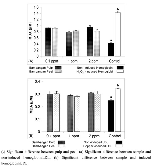 Comparison of malondialdehyde (MDA) equivalents between LDL oxidation treated with bambangan peels and pulp extracts (A); copper induced oxidation treated with bambangan peels and pulp extracts (B).