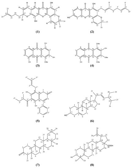 4-Methoxy-1,3,5-trihydroxyanthraquinone (3) [10], 2,5-dihydroxy-1,3,4-trimethoxyanthraquinone (4) [10], mammea A/AB (5) [11], stigmasterol (6) [13], friedelin (7) [13] and betulinic acid (8) [16,17] were identified by comparing their spectral data with literature.