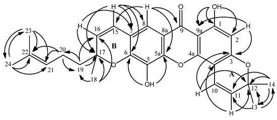 Moreover, the 1H-NMR spectra also supported the existence of a pyrano ring. Two vinylic protons were observed at δ 6.83 (1H, d, J = 10.1 Hz, H-10) and 5.58 (1H, d, J = 10.1 Hz, H-11) along with two methyl signals at δ 1.45 (3H, s, H-14) and 1.66 (3H, s, H-13). The methyl protons H-13 (δ 1.66) demonstrated 3J correlations with δ 27.1 (C-14) and H-14 (δ 1.45) showed 2J correlations with δ 80.7 (C-12) and 3J correlations with δ 126.1 (C-11) in the HMBC experiment. This pyrano ring was connected to the xanthone skeleton at C-3 and C-4 as evidenced by the 3J HMBC correlations between the vinylic proton at δ 6.83 (H-10) and δ 149.2 (C-4a) and δ 158.9 (C-3), while the other vinylic proton at δ 5.58 (H-11) correlates to δ 100.3 (C-4) via another 3J HMBC correlation.