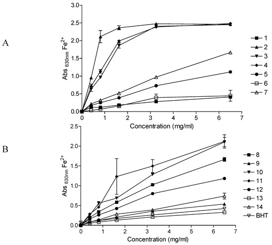 Ferric reducing activity of commercial herbal preparations (A; 1-7 and B; 8-14); BHT- butylated hydroxytoulene. Increase in absorbance of the reaction mixture indicates the increase in reducing power. Refer to Table 1 for the corresponding names of preparations 1-14.