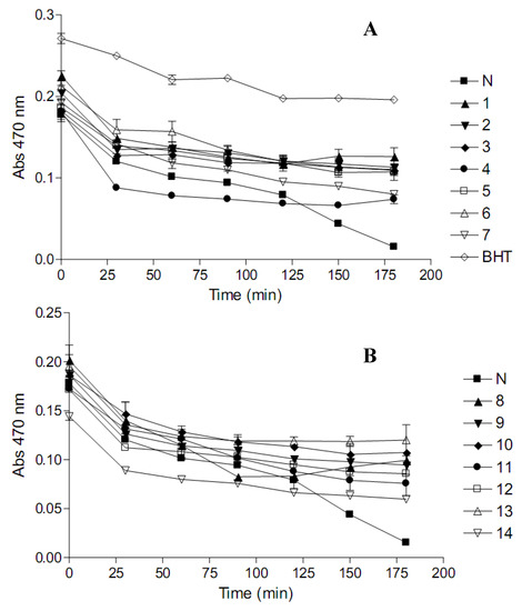Antioxidant activity of commercial herbal preparations (A; 1-7 and B; 8-14) as determined by the β-carotene-linoleic acid coupled oxidation model system. N- negative control (water) and BHT- butylated hydroxytoulene. Slow decrease in absorbance signifies protection of β-carotene; hence the test preparation is a potent antioxidant.