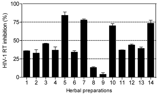 The National Research Foundation (NRF), Pretoria and the University of KwaZulu-Natal (UKZN) are thanked for their financial support. The authors also wish to thank G.I. Stafford (UKZN) and Mr. B. Maphumulo (UKZN Botanical Gardens) for their help in acquiring herbal products and converting isiZulu labels to English. Ms. S. Khumalo (Social Counsellor UKZN-AIDS Programme) is thanked for providing the antiretroviral drugs; Combivir® (GlaxoSmithKline) and Kaletra® (Abbott) used as positive controls in the HIV-1 reverse transcriptase assay.