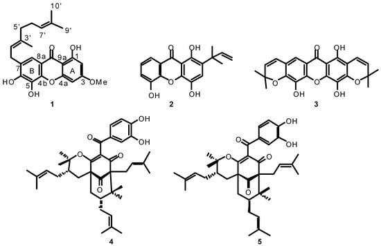 The bioguided fractionation of the ethyl acetate extract of trunk bark of Rheedia acuminata led to the isolation of the new 1,5,6-trihydroxy-3-methoxy-7-geranyl-xanthone (1) along with two xanthone analogues (2 and 3) and two PPAPs (4 and 5) (Figure 1).