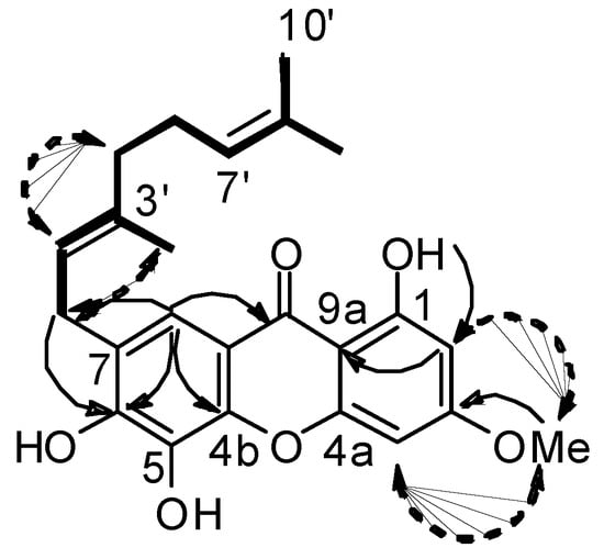 Compound 1 was obtained as a yellow oil. The HREIMS indicated a [M+H]- ion peak at m/z 409.1652, giving the molecular formula C24H25O6 (calc. 409.1651). The IR spectrum displayed free hydroxyl (3,410 cm−1), chelated hydroxyl (3,170 cm-1), conjugated carbonyl (1,640 cm−1) and aromatic ring (1,570 cm−1) peaks. These data, together with absorption bands observed at λmax 251, 283 and 327 nm in the UV spectrum and those obtained from 1D and 2D NMR experiments of compound 1 suggested the presence of a 1,3,5,6-tetraoxygenated xanthone system [10,11]. Examination of the 1H- NMR spectrum showed the presence of three hydroxyl groups with two broad signals at δH 7.88, 12.68 and one singlet at δH 14.02 ppm, corresponding to a chelated proton, one singlet at δH 8.08, two meta-coupled protons at δH 6.56 and 6.04 (1H, d, J = 2.3 Hz), and one methoxyl (δH 3.63). In addition two vinyl protons at δH 5.77 and 5.26 (1H, brt, J = 6.8 Hz), three methylene groups at δH 3.83 (2H, d, J = 7.3 Hz), 2.21 (2H, m) and 2.15 (2H, m), and three methyl groups at δH 1.84, 1.69, 1.59 (3H, s) suggested the presence of a geranyl side chain. HSQC experiments allowed the assignment of all protonated carbons. A combination of HMBC, COSY and NOESY experiments were used to establish the position of the substituents. In the HMBC spectrum (Figure 2), the chelated proton OH-1 showed correlations with C-2 at δc 97.6 on one hand, and the proton H-2 with carbons C-9a (δC 104.2), C-4 (δC 92.8), C-1 (δC 164.7) and C-3 (δC 166.7) on the other hand. A methoxy group was deduced from the correlation between the methyl protons at δH 3.63 with C-3. NOESY correlations between the methoxy at C-3 with protons H-2 (δH 6.56) and H-4 (δH 6.04) confirmed the position of the substituents on ring A (Figure 2). Furthermore, HMBC correlations observed between H-8 and C-9 (δC 181.5) were indicative of a peri location of the carbonyl. In addition, proton H-8 showed correlations with C-6 (δC 153.4), C-4b (δC 146.6), and CH2-1’ (δC 29.5) and a long-range correlation with C9a (δC 104.2). The geranyl side chain was deduced from the COSY spectrum with, on one hand, correlations observed between Me-9’ and Me-10’ [δH 1.59 (3H, s, H-9’) and 1.69 (3H, s, H-10’)] and the vinylic proton H-7’ at δH 5.28 (1H, brt, J = 6.8 Hz), which in turn showed a cross peak with H2-6’(δH 2.21, 2H, m). On the other hand, correlations observed between H2-5’ (δH 2.16, 2H, m) and H2-6’and H-2’ at δH 5.77 (1H, brt, J = 6.8 Hz), which in turn showed correlations with Me-4’(δH 1.84, 3H, s) and H2-1’(δH 3.83, 2H, d, J = 7.3 Hz) confirmed the presence of a geranyl side chain. The E configuration of the C-2’-C-3’ double bond was established by NOESY correlations observed between H2-5’ with H-2’, and Me-4’with H2-1’ (Figure 2). Finally, the position of the geranyl side chain at C-7 (δC 127.8) was confirmed by HMBC correlation from H2-1’ to C-6 (δc 153.4) (Figure 2). Compound 1, which was named 1,5,6-trihydroxy-3-methoxy-7-geranylxanthone, is a positional isomer of cowaxanthone and rubraxanthone isolated from Garcinia cowa [12,13].