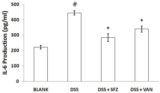To investigate the effect of vanillic acid on plasma IL-6 levels in mice affected with colitis, enzyme-linked immunosorbent assay (ELISA) was performed. Blood samples were obtained from the mice at the end of the experiment. As shown in Figure 2, the levels of IL-6 were significantly increased in the DSS-treated group compared to those in the control group. However, administration of vanillic acid reduced these increased levels induced by DSS.