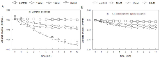 The results obtained from the analysis of the thiol peroxidase-like activity of 200 μM of diphenyl diselenide and its analogs and ebselen (50 μM) are presented in Figure 4 and Figure 5, respectively. In Figure 4, we observe that bischlorodiphenyl diselenide and bistrifluoromethyldiphenyl diselenide decomposed hydrogen peroxide with a similar efficiency, when compared to diphenyl diselenide. In contrast, bismethoxydiphenyl diselenide, biscarboxydiphenyl diselenide and hexamethyldiphenyl diselenide had no thiol-peroxidase-like activity. In Figure 5, the thiol peroxidase-like activity of ebselen could not be measured at 200 μM, because the readings at 305 nm were higher than the limit of the spectrophotometer.