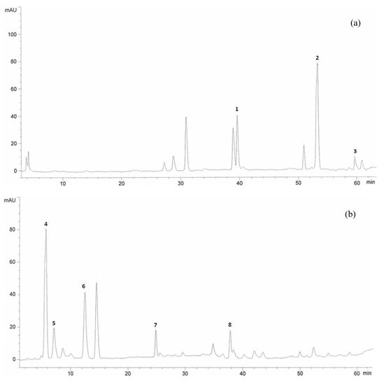 HPLC chromatogram of Halia Bentong ginger (Zingiber officinale) leaves extracts at wavelengths of 360 nm (a), and 280 nm (b). Identification of compounds: quercetin (1), rutin (2), kaempferol (3), fisetin (4), morin (5), catechin (6), epicatechin (7), naringenin (8).