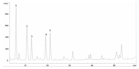 HPLC chromatogram of Halia Bentong ginger (Zingiber officinale) leaves extracts. Identification of compounds: gallic acid (1), vanillic acid (2), ferulic acid (3), cinnamic acid (4), salicylic acid (5).