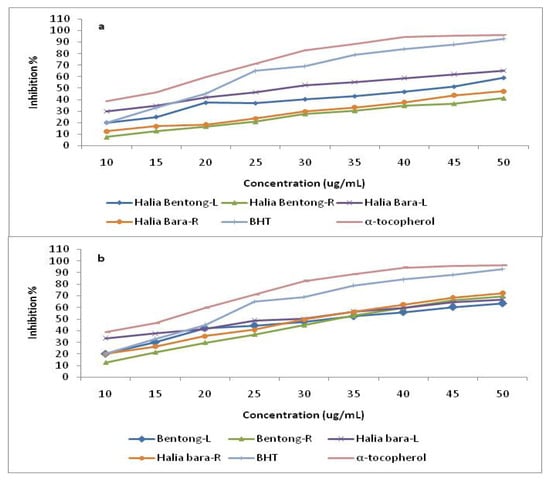 Under ambient conditions (400 µmol mol-1 CO2), ginger leaves exhibited higher radical scavenging activity than rhizomes (Figure 3). At a concentration of 30 µg mL-1 leaves of Halia Bara showed a 50.0% inhibition of free radicals, and at 45 µg mL-1, the scavenging activity of the methanolic extract of Halia Bara leaves grown under ambient CO2 concentration (400 µmol mol-1) reached 62.1%, while at the same extract concentration, that of the rhizomes was 42.0% (Figure 4), while 50% free radical scavenging activity was observed for Halia Bentong leaves at 45 µg mL-1 extract concentration, implying that Halia Bara, under natural environmental conditions, had higher antioxidant properties than Halia Bentong, and that was found in the leaves.