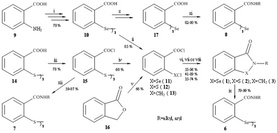 The strategy for the synthesis of N-substituted bis(2-carbamoyl)phenyl diselenides 6 has been based on the reductive cleavage of the Se-N bond in corresponding benzisoselenazol-3(2H)-ones [7]. The selenides 8 have been prepared by the treatment of bis(2-chlorocarbonylphenyl) selenide, obtained from bis(2-carboxyphenyl) selenide 17, with primary amines.