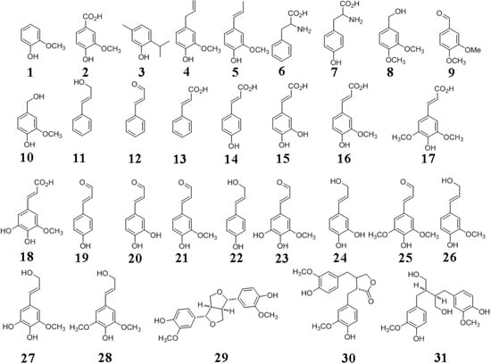 Structures of phenols relevant to lignin. 1, guaiacol; 2, vanillin; 3, thymol; 4, eugenol; 5, isoeugenol; 6, phenylalanine; 7, tyrosine; 8, veratryl alcohol; 9, veratraldehyde; 10, vanillyl alcohol; 11, cinnamyl alcohol; 12, cinnamaldehyde; 13, cinnamic acid; 14, p-coumaric acid; 15, caffeic acid; 16, ferulic acid; 17, sinapic acid; 18, 5-hydroxyferulic acid; 19, p-coumaraldehyde; 20, caffeoyl aldehyde; 21, coniferaldehyde; 22, p-coumaryl alcohol; 23, 5-hydroxyconiferaldehye; 24, caffeoyl alcohol; 25, sinapaldehyde; 26, coniferyl alcohol; 27, 5-hydroxyconiferyl alcohol; 28, sinapyl alcohol; 29, (+)-pinoresinol; 30, matairesinol; 31, (-)-secoisolariciresinol. Phenols 29 to 31 are lignans.