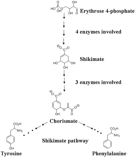 Overview of the shikimate pathway for the biosynthesis of phenylalanine and tyrosine.