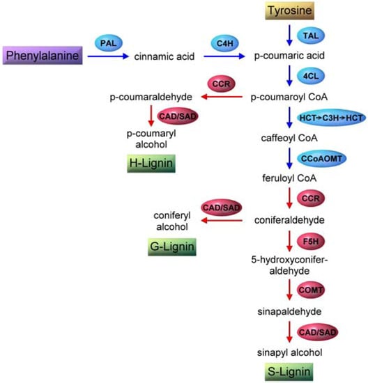 Outline of enzymes/pathways involved in monolignol biosynthesis. Enzymes are enclosed in ellipses while substrates and products are boxed. Phenylpropanoid pathway is shown in blue and monolignols biosynthesis in red. Arrows indicate sequential enzymatic steps. Abbreviations are (order of appearance): PAL, phenylalanine ammonia lyase; C4H, cinnamate 4-hydroxylase; TAL, tyrosine ammonia lyase; 4CL, 4-coumarate-CoA ligase; CCR, hydroxycinnamoyl-CoA reductase; CAD, coniferyl alcohol dehydrogenase; SAD, sinapyl alcohol dehydrogenase; HCT, p-hydroxycinnamoyl-CoA:quinate shikimate p-hydroxycinnamoyl-CoA transferase; C3H, p-coumarate 3-hydroxylase; CCoAOMT, caffeoyl-CoA O-methyltransferase; F5H, ferulate 5-hydroxylase (coniferaldehyde 5-hydroxylase); COMT, caffeic acid/5-hydroxyferulic acid O-methyltransferase.