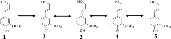 - Achyuthan, K.E.; Adams, P.D.; Simmons, B.A.; Singh, A.K. Spectroscopic analyses of the biofuels-critical phytochemical coniferyl alcohol and its enzyme-catalyzed oxidation products. Molecules 2009, 14, 4758–4778. [Google Scholar] [CrossRef]