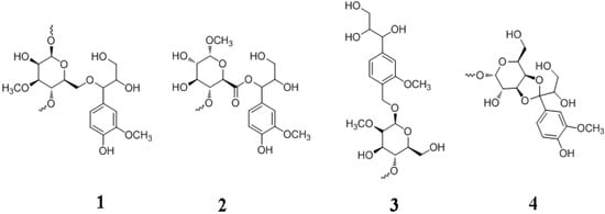 - Whitmore, F.W. Lignin carbohydrate complex formed in isolated cell walls of callus. Phytochemistry 1978, 17, 421–425. [Google Scholar] [CrossRef]