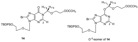 N9-[(5′-tert-Butyldiphenylsilyloxyethoxy)methyl]-8-bromohypoxanthine (13). To a solution of 12 (700 mg, 2.42 mmol) in anhydrous DMF (10 mL) was added imidazole (1.86 g, 24.2 mmol) and tert-butyldiphenylsilyl chloride (3.4 mL, 12.1 mmol) under argon, and the mixture was stirred at room temperature for 12 h. And the mixture was evaporated in vacuo, the residue was partitioned between CH2Cl2 and H2O. The aqueous phase was extracted again with CH2Cl2, the organic layer was combined and washed with brine, dried (Na2SO4), filtered and concentrated in vacuo. Flash chromatography (PE-acetone = 5:1) afforded compound 13 (1.21 g, 95%). 1H-NMR (400 MHz, CDCl3) δ 1.06 (s, 9H, (CH3)3C-), 3.71-3.73 (m, 2H, H4′), 3.82-3.84 (m, 2H, H5′), 5.66 (s, 2H, H1′), 7.37-7.69 (m, 10H, ArH), 8.44 (s, 1H, H2),13.19 (s, 1H, NH). 13C-NMR (100 MHz, CDCl3) δ 157.8, 150.8, 146.3, 135.5, 133.3, 129.6, 127.6, 126.4, 124.6, 77.3, 77.0, 76.7, 73.5, 71.1, 62.9, 26.7, 19.0. HRMS (ESI-TOF+): calcd for C24H27BrN4O3Si [(M + H)+] 527.1109, [(M + Na)+] 549.0928, [(M + K)+] 565.0662; found, 527.1109, 549.0931, 565.0667.