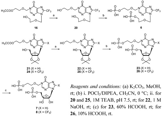 N1-[(5′′-Phosphonoxyethoxy)methyl]-N9-[(5′-Phosphonoxyethoxy)methyl]-8- trifluoromethylinosine (6). Compound 16 (20 mg, 0.051 mmol) was dissolved in methanol (2 mL). To the solution was added K2CO3 (1 mg, 7.24 μmol) at room temperature and stirred for 6h. The mixture was neutralized by addition of 0.01 M HCl solution, and removed of the solvent in vacuo. The residue was partitioned between CHCl3 and H2O, and the organic layer was washed with brine, dried (Na2SO4), and evaporated, affording compound 20 (16 mg). Compound 20 (16 mg, 0.045 mmol) was dissolved in anhydrous CH3CN (5 mL). DIPEA (94 μL, 0.54 mmol) and POCl3 (42 μL, 0.45 mmol) were added successively to the solution at −20 °C. The mixture was stirred at 0 °C for 16 h, and then added 5 mL of TEAB (1 M, pH 7.5) at 0 °C and stirred for 6 h at room temperature. After evaporation under reduced pressure, the residue was partitioned between H2O and CHCl3, and the aqueous layer was washed with CHCl3 and evaporated in vacuo. The residue was dissolved in 5 mL of TEAB buffer (0.05 M, pH 7.5), and applied to a C18 reversed-phase column (2.2 × 25 cm). The column was developed using a linear gradient of 0-40% CH3CN in TEAB buffer (0.05 M, pH 7.5) within 30 min to give 6 (22.3 mg, 62% for two steps) as its triethylammonium salt. 1H-NMR (400 MHz, D2O) δ 3.73-3.79 (m, 4H, H4′, H5′), 3.85-3.92 (m, 4H, H4′′, H5′′), 5.45 (s, 2H, H1′′), 5.77 (s, 2H, H1′), 8.51 (s, 1H, H2). 13C-NMR (100 MHz, D2O) δ 157.8, 151.0, 149.7, 138.6 (q, 2JCF = 41 Hz), 122.2, 117.9 (q, 1JCF = 270 Hz), 76.4, 73.3, 69.5, 69.2, 64.1, 63.8. 19F-NMR (470 MHz, D2O) δ -62.9 (s). 31P-NMR (D2O, 243 MHz, decoupled with 1H) δ 0.19 (s), 0.22 (s). HRMS (ESI-TOF−) calcd for C12H17N4O11P2F3 [(M − H)−], 511.0248; found, 511.0246.