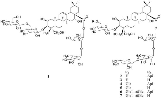 The six known saponins were identified as platycodin D (2), deapio platycodin D (3), platycodin D3 (4), deapio platycodin D3 (5), platycoside E (6) and deapio platycoside E (7) through comparison of their UV, IR, NMR and MS data with literature values [25,26].