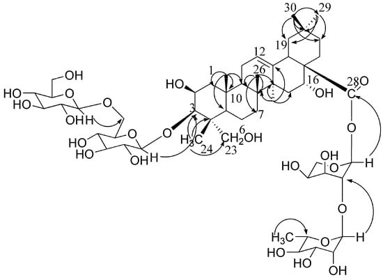 Platycoside N (1) was a white amorphous powder, and its molecular formula C53H86O24 was determined based on the HR-ESI-MS spectra. The oleanane-type triterpenoid saponin nature of compound 1 was revealed through analysis of its spectral features. The IR spectrum exhibited absorptions at 3,425 cm−1 (OH), 1,647 cm−1 (ester carbonyl), and 1,616 cm−1 (double bond). Six methyl groups (δ 0.89 × 2, 0.98, 1.17, and 1.58 × 2) and one olefinic proton (δ 5.46, br s) of the aglycon were observed in the 1H-NMR spectrum. The 13C-NMR spectrum showed that the aglycon had six methyl carbons at δ 16.0, 18.6, 17.7, 27.2, 33.3, and 24.8, two olefinic carbons at δ 123.1 (CH) and 144.5 (C), one oxymethylene and three oxymethine carbons at δ 66.6, and 70.1, 74.2 and 83.1, respectively, and one carbonyl carbon at δ 176.0 (Table 1). The information of the 1H-NMR spectrum coupled with the 13C-NMR spectrum indicated that 1 had 2β,3β,16α,23-tetrahydroxyolean-12-en-28-oic acid (polygalacic acid) as an aglycon [20]. The 13C-NMR spectrum showed 53 signals, of which 30 were assigned to a triterpenoid moiety and 23 to the saccharide portion. The downfield shift of C-3 (δ 83.1) and for the upfield shift of C-28 (δ 176.0), revealed that the sugar moieties were attached to the aglycon at these two positions. The 1H and 13C-NMR spectra of 1 exhibited four anomeric protons at δ 5.10 × 2 (2H, d, J = 7.5 Hz), 6.27(1H, d, J = 2.5 Hz), 5.68 (1H, br s) ppm and carbons at δ 106.7 × 2, 93.9, 101.5 (Table 1). In the 1H-NMR spectrum, one methyl signal at δ 1.59 (3H, d, J = 5.5 Hz) belonging to rhamnose was observed. In addition, the monosaccharides were identified as glucose, rhamnose and arabinose by TLC and a combination of DEPT, HMQC and HMBC experiments. Acid hydrolysis of 1 also gave glucose, arabinose and rhamnose in a ratio of 2:1:1 respectively, as confirmed by GC analysis of the respective trimethylsilyl derivatives [20]. The 1H- and 13C-NMR and 2D-NMR analysis indicated that all the monosaccharides of 1 were in pyranose forms. The β-anomeric configurations of the D-gulucose units were determined by its 3JH1,H2 coupling constants (7.5 Hz). The α-anomeric configurations of the L-arabinose and L-rhamnose were determined by the broad singlet of their anomeric protons [24]. The linkages between sugar moieties and C-3 of the aglycon were corroborated through HMBC experiments, i.e., H-1 (δ 5.10) of the terminal glucose correlated with C-6 (δ 70.8) of the inner glucose, and H-1 (δ 5.10) of the inner glucose correlated with C-3 (δ 83.1) of the sapogenin. The linkages of sugar moieties at C-28 were established based on HMBC correlations between H-1 (δ 5.68) of rhamnose and C-2 (δ 75.3) of arabinose, and H-1 (δ 6.27) of arabinose and C-28 (δ 176.0) of aglycone (Figure 2). On the basis of all the above evidence, platycoside N (1) was identified as 3-O-β-D-glucopyranosyl-(1→6)-β-D-glucopyranosyl-2β,3β,16α,23-tertahydroxyolean-12-en-28-oic acid 28-O-β-L-rhamnopyranosyl-(1→2)-α-L-arabinopyranoside.