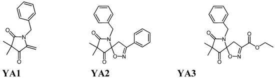 Three novel compounds were tested in this study; pyrrolidine 1-benzyl-3,3-dimethyl-5-methylenepyrrolidin-2,4-dione (YA1) and spiroisoxazoline type compounds; (5S)-6-benzyl-8,8-dimethyl-1-oxa-3-phenyl-2,6-diazaspiro{4.4}non-2-ene-7,9-dione (YA2) and (5R)-ethyl 6-benzyl-8,8-dimethyl-7,9-dioxo-1-oxa-2,6-diazaspiro{4.4}non-2-ene-3-carboxylate (YA3). The two spiroisoxazoline compounds (YA2 and YA3) were synthesized from the pyrrolidine 1-benzyl-3,3-dimethyl-5-methylenepyrrolidin-2,4-dione (YA1).