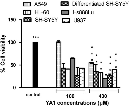 Cytotoxicity effects of YA2 in normal and tumour cell lines after 24 h incubation. Values are means ± SD (n = 3), all comparisons were made using two-tailed Student's t-test (* p < 0.05, ** p < 0.01, *** p < 0.001).