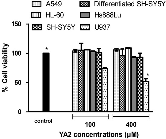 Benzyl-3,3-dimethyl-5-methylenepyrrolidin-2,4-dione (YA1) showed differential cytotoxic activity against the human cell lines tested in this study (Figure 2). It exhibited a 50% reduction (p < 0.001) in the cell viability in HL-60, SH-SY5Y and differentiated SH-SY5Y cells compared to control after 24 h treatment at a 60 µM concentration. However, this agent was less potent in Hs888Lu and A549 cells, reducing viability by 50% reduction at 150 µM (p < 0.05) and > 400 µM (p < 0.001), respectively. The data shows that U937 is the cell line most sensitive to YA1, with an IC50 value of 40 μM (p < 0.001). The possibilities regarding mechanism of toxicity need further investigation. There have been no studies on the mechanism of action of these agents in these cancer and normal cell lines. The pyrrolidine drug class have been shown to influence cholinergic function [20,21,22,23], affect intracellular calcium and N or L type calcium channel conductance [24,25] and act as agonists at the α-aminopropionic acid (AMPA) receptor [26,27,28]. Other mechanisms of actions are increased nitric oxide synthase activity, haemorrheological and antithrombotic effects, changes to the physical properties of membranes [29] and enhanced membrane fluidity [30], presumably by binding to a membrane phospholipid.