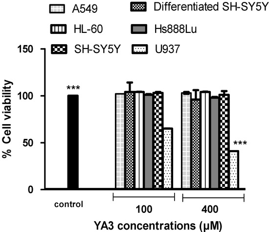 Shows the results expressed as percentage of living, apoptotic, and dead cells in U937 cell lines treated with YA2 for 24h. Values are means ± S.D. of at least three independent experiments (* P < 0.05, ** P < 0.01, *** P < 0.001). All comparisons were made using two-tailed student’s t-test.