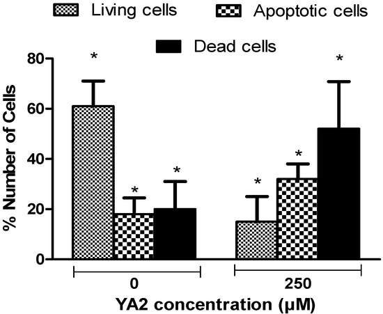 To show whether the growth inhibition induced by spiroisoxazoline type compounds in U937 cells was caused by induction of apoptosis, the cells were stained with Annexin V-Biotin. Apoptotic rate was analyzed by bioanalyzer [34], as shown in Figure 6. The apoptotic cell population in U937 cell lines increased gradually from 18% in control, to 32% after exposure to 250 µM YA2 for 24 h. Significant decreases in living and increases in necrotic cell population (p < 0.05) were observed following 24 h of treatment with 250 µM YA2 (Figure 6). Treatment with YA3 also exhibit significant increase in apoptotic cell population under the same conditions (data not shown).