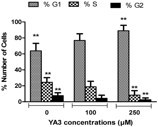 Cells in exponential growth were counted and plated in 6-well plates at a cell density 1×105 cells/mL in medium for 24 h. The cells were then treated with 10, 100, and 250 µM of YA2 or YA3 for 24 h. Following the treatments, cells were harvested according to the method of Kalejta et al. [48] and analysed using flow cytometry (FACSCalibur, BD Bioscience) as described previously [48]. Quantification of the cell cycle distribution and the percentage of the distinct cell cycle phases were gated and calculated using the FCSexpress and MultiCycle software.