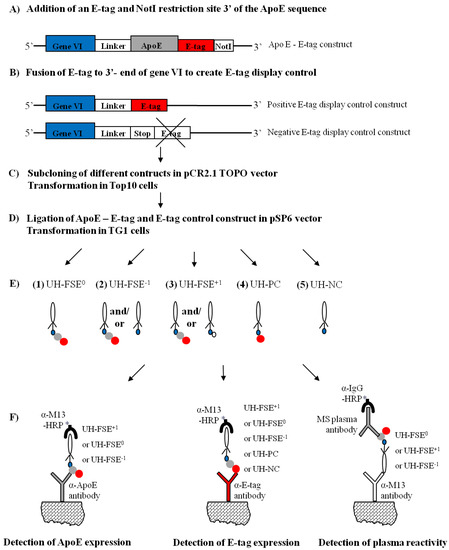 An overview of the study is represented in Figure 2. An ApoE - E-tag construct was generated byC-terminal fusion of an E-tag (GAPVPYPDPLEPR) and NotI restriction site to the ApoE sequence of UH-FS using the ApoE forward and E-tag reverse primer (see Figure 2A and Table S1 for primer sequences in the appendix). A negative control (NC) for E-tag display was generated by an out of frame fusion of the E-tag to the 3’-end of gVI (Figure 2B), resulting in a stop codon preventing the display of the E-tag. This was done using the overlapping ApoE forward and the NC reverse primer. A positive control (PC) for E-tag display was generated by using the overlapping ApoE forward and PC reverse primer. Addition of an extra nucleotide to the PC reverse primer resulted in an in frame fusion of the E-tag at the 3’-end of gVI. All primers were obtained from Eurogentec (Seraing). PCR products were purified using the GFX gel band purification kit (GE Healthcare), ligated into the pCR2.1 TOPO vector and transformed into Escherichia coli (E. coli) Top10 cells according to manufacturer’s instructions (TopoTA cloning kit, Invitrogen; Figure 2C). Insert sequences were confirmed using M13 forward and reverse primer. After BglII and NotI digestion, the ApoE – E-tag and the E-tag control constructs were ligated into the pSP6 vectors digested with the same restriction enzymes (Figure 2D). Ligation mixtures were used to transform E. coli TG1 cells by electroporation to obtain UH-FSE0 (correct reading frame of the ApoE gene), UH-FSE−1 (−1 shift in the reading frame of the ApoE gene), UH-FSE+1 (+1 shift in the reading frame of the ApoE gene), UH-PC (positive E-tag display control) and UH-NC (negative E-tag display control) as depicted in Figure 2D. Resulting colonies were picked and sequence was confirmed with gVI forward primer. Phage were purified as described previously [17]. Purified phage clones were used in ELISA to analyse immunoreactivity towards the displayed ApoE protein on the one hand and the level of E-tag expression on the other hand (Figure 2F).