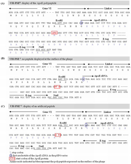 The inserted cDNA sequence of UH-FS encoded part of the signal sequence in addition to the first 130 amino acids (AA) of the ApoE protein. However, due to out of frame insertion of the ApoE gene in the pSP6 phagemid vector, a stop codon was observed immediately after gVI that prevented the display of the corresponding ApoE polypeptide. In order to detect whether this clone could be subjected to frameshifting, an E-tag was cloned in frame at the 3’-end of the ApoE cDNA as depicted in Figure 2A in order to obtain simultaneous expression of the ApoE polypeptide and the E-tag. This ApoE - E-tag construct was then subcloned into the pSP6 vector in 3 different reading frames (Figure 2E). This resulted in the insertion of the ApoE - E-tag in the 0 frame (designated UH-FSE0, Figure 3A) which represents the correct reading frame for the ApoE polypeptide to be expressed, the −1 frame (designated UH-FSE−1, Figure 3B) where a stop codon prevents the display of a peptide and the +1 frame (designated UH-FSE+1, Figure 3C) in which an artificial peptide of 17 AA is displayed at the surface of the phage. As a control for E-tag expression, the E-tag alone was inserted in the pSP6 vector in the 0 frame (designated UH-PC) and in the −1 frame (designated UH-NC) resulting in respectively high and no E-tag expression (Figure 2B).