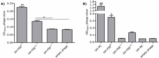 (A) Detection of ApoE expression. ApoE expression of UH-FSE0, UH-FSE−1 and UH-FSE+1 was measured via ELISA. Empty phage was used to determine background values. Experiments were performed twice independently. All samples were tested in duplicate in one ELISA. ** p < 0.001; * p < 0.01 as evaluated by one-way ANOVA followed by Tukey post-hoc test; (B) Detection of E-tag expression. E-tag expression of UH-FSE0, UH-FSE−1 and UH-FSE+1 was measured via ELISA. UH-PC was used as a positive E-tag display control whereas UH-NC was used as a negative E-tag display control. Empty phage was taken along to determine background values. Experiments have been performed 4 times independently, all samples were tested in duplicate. ** p < 0.001; * p < 0.01 except for UH-FSE0vs. UH-FSE+1p < 0.05 as evaluated by one-way ANOVA followed by Tukey post-hoc test.